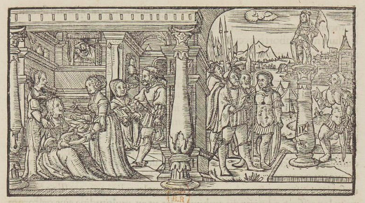Queen Semiramis of Assyria, perhaps the original inventor of chastity belts, sits with two women on the left of the scene. She often successfully dressed as her son, as they shared many similarities both in appearance and voice, to be able to participate in battle. Her son, which was her in disguise, was celebrated for this, as seen in the statue that depicts her dressed as her son, but she was chastised for being promiscuous in her female identity.