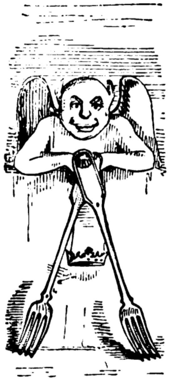 - A winged and horned devil leans over a wall. Against the wall lean two large forks with a crown floating between them to form the letter A from All.