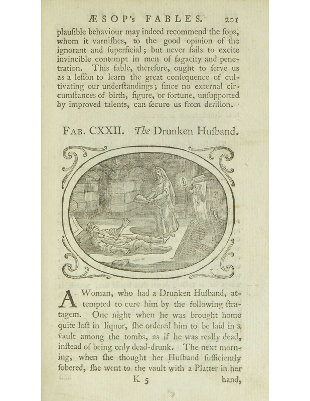 A drunk man lays on the ground while reaching out with his left hand towards a woman who approaches him with a platter of food. They are inside of a tomb, an underground cemetery, which is lit up by a single flame coming from a candle on the wall. The man and woman are husband and wife.