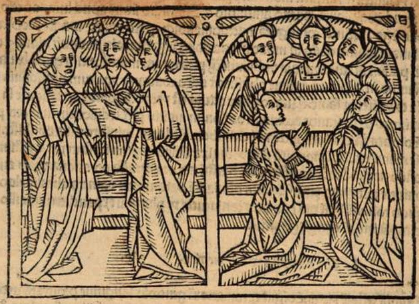 Verginia, a noble Roman woman is depicted in this engraving in both the right and left scenes. Boccaccio explains that Verginia, despite being a noble woman, was cast out of a temple in Rome by the other noble patrician women due to her being married to a plebeian man. The right side of the engraving depicts Verginia at the altar with noble women surrounding her as they cast her out of the temple. The left side of the engraving looks similar to the right side; however, the left side depicts Verginia with plebeian women. After being cast out of the Patricia Pudicitia temple, Verginia created her own temple and altar named the Plebeia Pudicitia, and opened it up to the plebeian class.