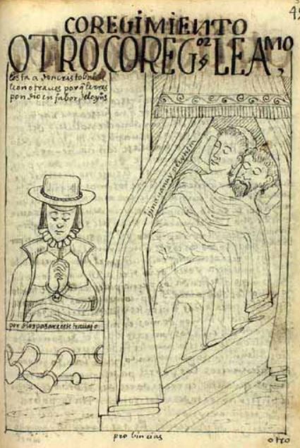 This image is illustrated in a chapter that discusses and criticizes the government and society in Spanish conquered Peru. This image depicts a Corregidor [Magistrate] sleeping comfortably in his bed with a female companion on the right side of the image. There is a man named Don Cristobal de Leon on the left side of the image with his hands and feet shackled and legs in a stock. The author explains that the Corregidor in this image and the previous Corregidor both imprisoned and abused Don Cristobal for speaking in favour for the indigenous peoples of Peru. There is writing on the curtains of the Corregidor’s bed which represent his dialogue. It reads, hina wanuy pleytista [die where you are, troublemaker]. There is also writing on the stock that Don Cristobal’s legs are in. It reads, por dios pasare este trauajo [For God I will suffer these troubles].