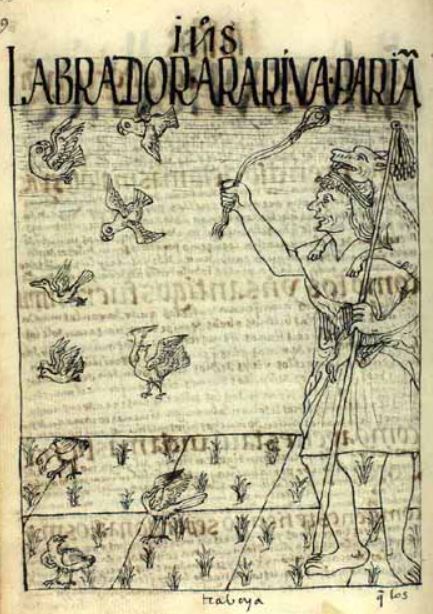 This image depicts a native man standing in a field protecting a field of crops from the swarm of sparrows. The man is holding a whip in his right hand as he swings it towards the birds and he is holding a walking stick in his left hand. His guard dog is depicted helping him scare away the birds as he rests on his back and rests on his head. Some birds are flying in the air while three are on the ground eating the sprouts coming out from the ground. The caption at the bottom of the image reads, trabajo [labour].