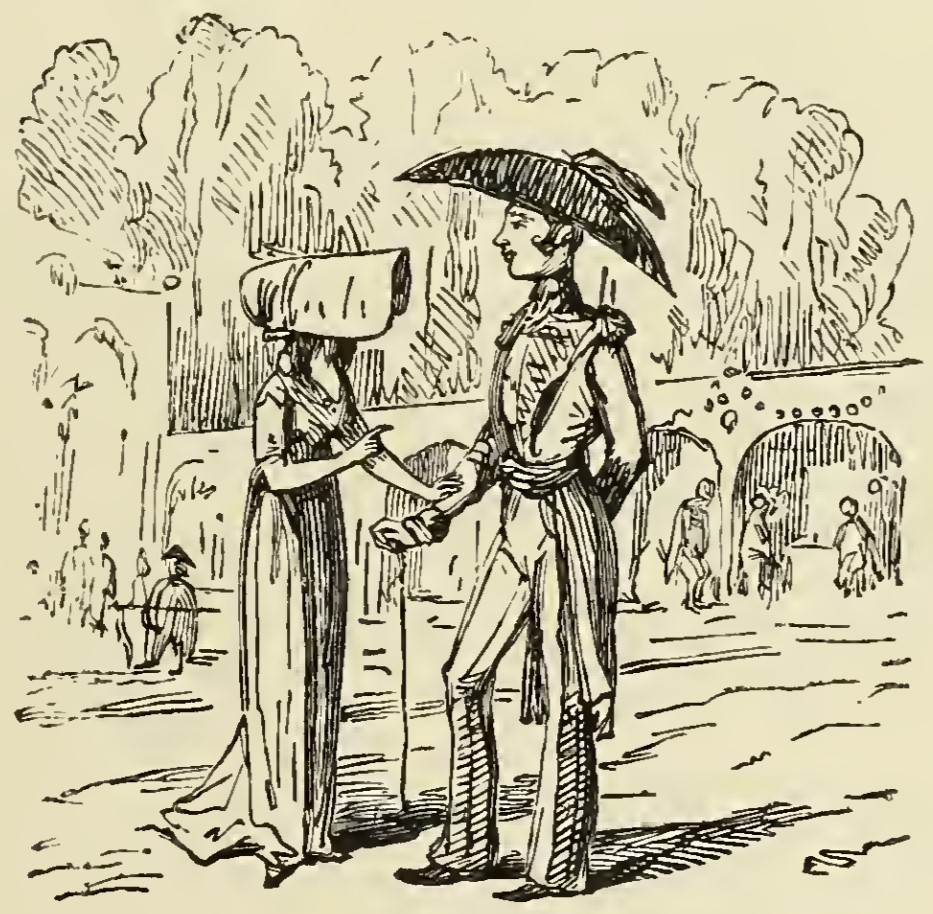 An illustration of a lady and officer, attired as they would accurately be at the time of the story. The lady wears a long, thin dress and elongated bonnet, while the officer wears a coat with tails and oversized, pointed hat, and carries a very thin cane. In the background are many small figures and what appears to be an elaborate bridge or terrace pagoda.