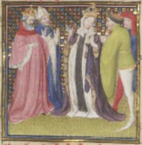 This image depicts Constance, the daughter of King William of Sicily, about to marry Henry, the emperor of Rome. Constance was forced to be a nun at a young age due to a prophecy which foretold Constance would somehow cause the destruction of Sicily. Her father, William, put her in a convent to prevent the prophecy from happening. At an older age, Constance was forced to marry Emperor Henry as her father had died and the throne was to be kept within the family. Constance then gave birth to a son at the age of fifty-five (despite being fifty-five, Constance is depicted young in this image). Constance is depicted in a black cloak and a crown on her head. Henry is depicted wearing a crown and a red robe on the left side of the image. A bishop is illustrated beside Henry as he officiates the marriage. There are two additional figures on the right side of the image.