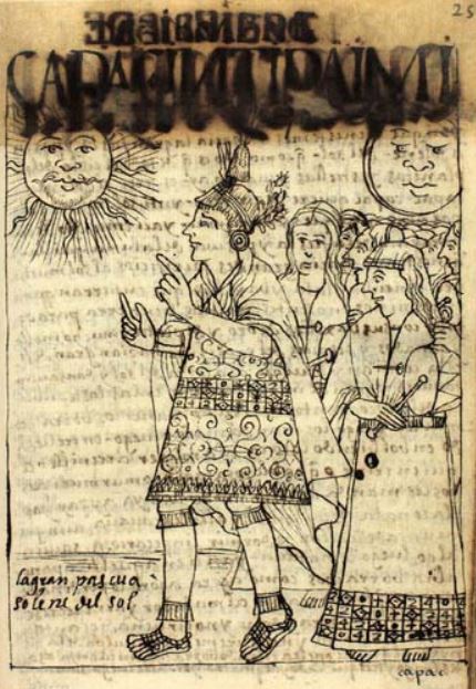 This chapter is dedicated to discussing the traditions and rituals of each month during the Inca Empire. The Incas tracked the months and years through the stars and their months consisted of thirty days. This image depicts the month of December, which was dedicated to celebrating the Sun, the king of all things. Many sacrifices of gold, silver and children, all dedicated to the sun were performed throughout this month. After the sacrifices they would have a large festival. This image depicts the celebrations as a crowd gathers underneath the sun. The Inca Emperor is illustrated standing in front of the crowd looking at the sun. The people behind him are playing musical instruments. The caption at the bottom of the image reads la gran pascua solene del sol, which translates to the great Easter-like festival of the Sun.
