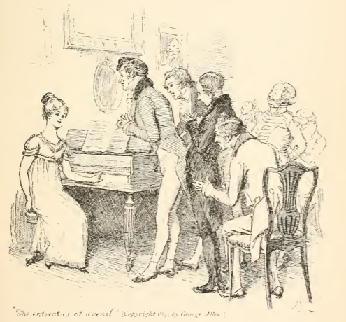 In this image Lizzy sits at a piano at a party hosted by Colonel William Lucas. Mr. Darcy became interested in Lizzy, wanting to spend more time with her, despite his initial rejection of her. Upper class women of this era were encouraged to practice some art form, often drawing or playing piano. Lizzy played piano and several people at this party entreated her to play for them. This scene occurs in chapter 6. The characters are shown in the traditional regency style. The men wear waistcoats and tailcoats with cravats. Lizzy wears a regency style dress with an empire waistline. The regency period dated to the early nineteenth century (1811-1820) when George, Prince of Wales, later George IV (r. 1820-1830), reigned as regent for his mentally ill father, King George III (r. 1760-1820). The regency period is associated with the rise of neoclassicism in art and fashion.