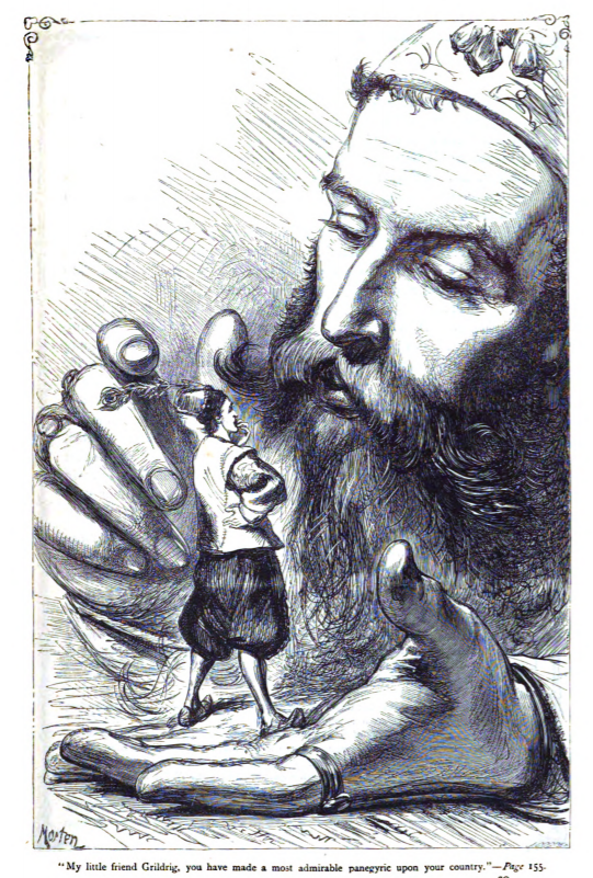 Here the King of Brobdingnag holds Gulliver in his hand as Gulliver tells him about the customs and traditions of England and elsewhere in Europe. Gulliver’s name in Brobdingnag was ‘Grildig’. The King found several English customs to be very bizarre and laughs as Gulliver explains them. The two often debated the correct manners for policies and running a country.