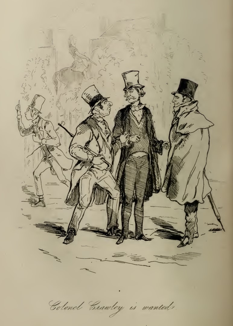 Rawdon Crawley stands with Mr. Moss and his assistant each holding one of his hands. They have come to collect his debt to Mr. Nathan. In the background Mr. Wenham, who has no money to lend him, is leaving with his hand raised and his cane tucked under his arm. Below the illustration is printed in cursive its title, Colonel Crawley is wanted.