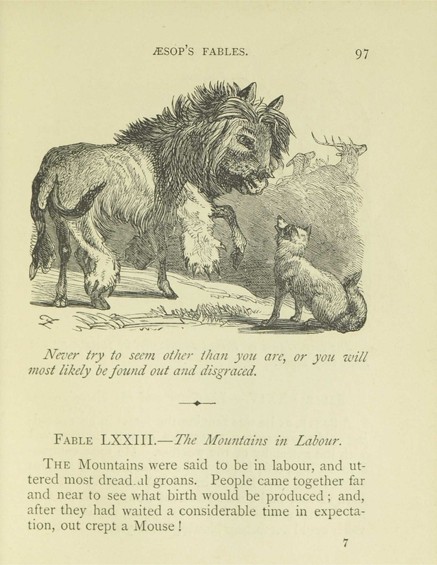 A large donkey stands in the left part of the image. It wears a lion costume, the limbs of the costume hanging awkwardly, the tail hanging still. The tail, limbs and face of the donkey are obviously visible. The donkey looks at a fox sitting to its right. The fox looks up at the costumed donkey. Behind them a cluster of deer run away.