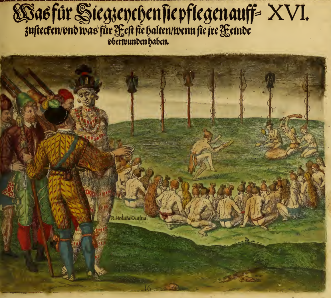 A group of Indigenous people sit on the ground in a semi-circle. A man dances in the middle of the group. In the background, the body parts of the defeated enemies have been mounted on poles that have been stuck into the ground as trophies. In the foreground an Indigenous man stands with a few colonists. This illustration is identical to the one found on page 67 of Frankfurt 1591, but colored.