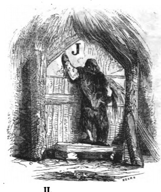 Here we see Gulliver in his room on the Country of the Houyhnhnms. His room was built about six yards from the main house and made of clay. Gulliver had mats made of rush plants, and a mattress made with hemp and filled with feathers. In this image we see Gulliver cleaning his house. He wears clothes of leather made from the dried skins of yahoos. The same image appears in the 1843 Krabbe edition.
