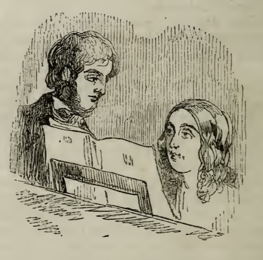 George Osborne and Amelia Sedley are seated at the piano, gazing at each other, with a book of sheet music open in front of them.