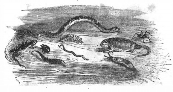 Here we see several types of reptiles and insects, including a snake, a spider, a slug, a worm, a caterpillar, and two lizards. They are shown because following Gulliver’s explanation of the various political and legal traditions in England, many of which were very corrupt, the King of Brobdingnag compared the English and their nobility, politicians, lawyers, among others to vermin. The same image appears in the 1843 Krabbe edition.