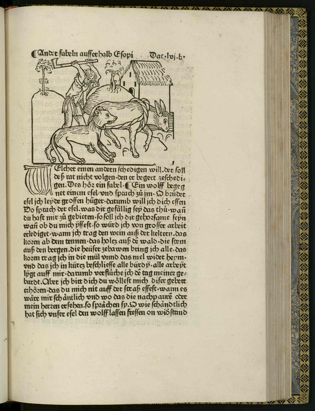 - In the middle of the image, there is a donkey with ropes around his body connected like a leash to a wolf. The donkey is dragging the wolf forward. Behind them there is a man with an ax about to hit one of the animals. On the upper left side of the image there is a house.