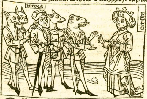 This engraving depicts Circe, the daughter of the Sun, on the right side of the engraving. We know that this is Circe as her name is engraved beside her body. Boccaccio explains that Circe was skilled in the art of magic and would often turn people who landed on her shores into animals. When Ulysses and his men happened upon Circe, she transformed Ulysses’ companions into beasts. They are depicted in the engraving with their bodies still in human form, while their heads are changed into animals such as lions and pigs. Ulysses is the one man among them that is still in human form (his name is engraved above his head). Ulysses threatens Circe with his sword, and she eventually changes his companions back into their original forms.