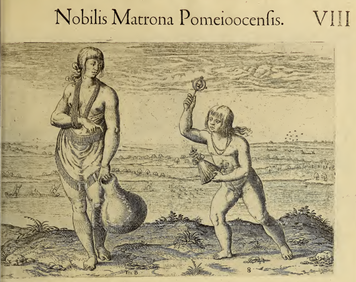 An Indigenous woman, a chief, is pictured standing on the bank of a river. Her hair is knotted at the nape of her neck, she wears several strands of beads around her neck, and her right wrist is cradled in the beads. She wears a fringed skirt around her waist and is topless and shoeless. She holds a large pot/container in her left hand. Beside her is a child, nude except for two strands of beads around their neck. The child holds a doll dressed like an English lady in one hand, and an object similar to a rattle in the other. Behind the pair, other Indigenous people are seen in canoes.
