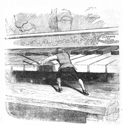 [Gulliver plays piano using sticks on Brobdingnag]