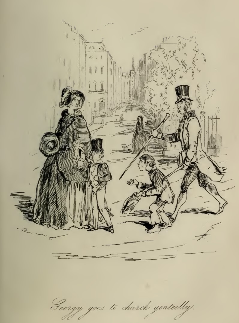 Georgy Osborne in a top hat and suit, holds onto his aunt Jane Osborne’s hand, turned to face the boy who has come up behind him. He is a young sweep, barefoot and with ragged clothes, begging for money. The footman, carrying the church books, is behind the sweep, trying to drive him away with a cane. In the background is Amelia Osborne, who was going for a walk on the cross-street to the one the others are taking to church, watching proudly as her son gives money to the sweep. Below the illustration is printed in cursive its title, Georgy goes to church genteelly.