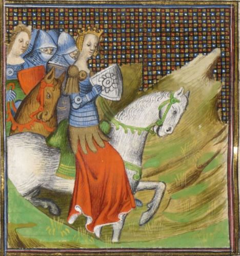 This image depicts Orithya and Antiope, the queens of the Amazons, riding on their horses while suited in armor. They are depicted not wearing helmets in order to differentiate them from the other Amazon women behind them. The queen in the front is also depicted wearing a crown to symbolize her royal status.