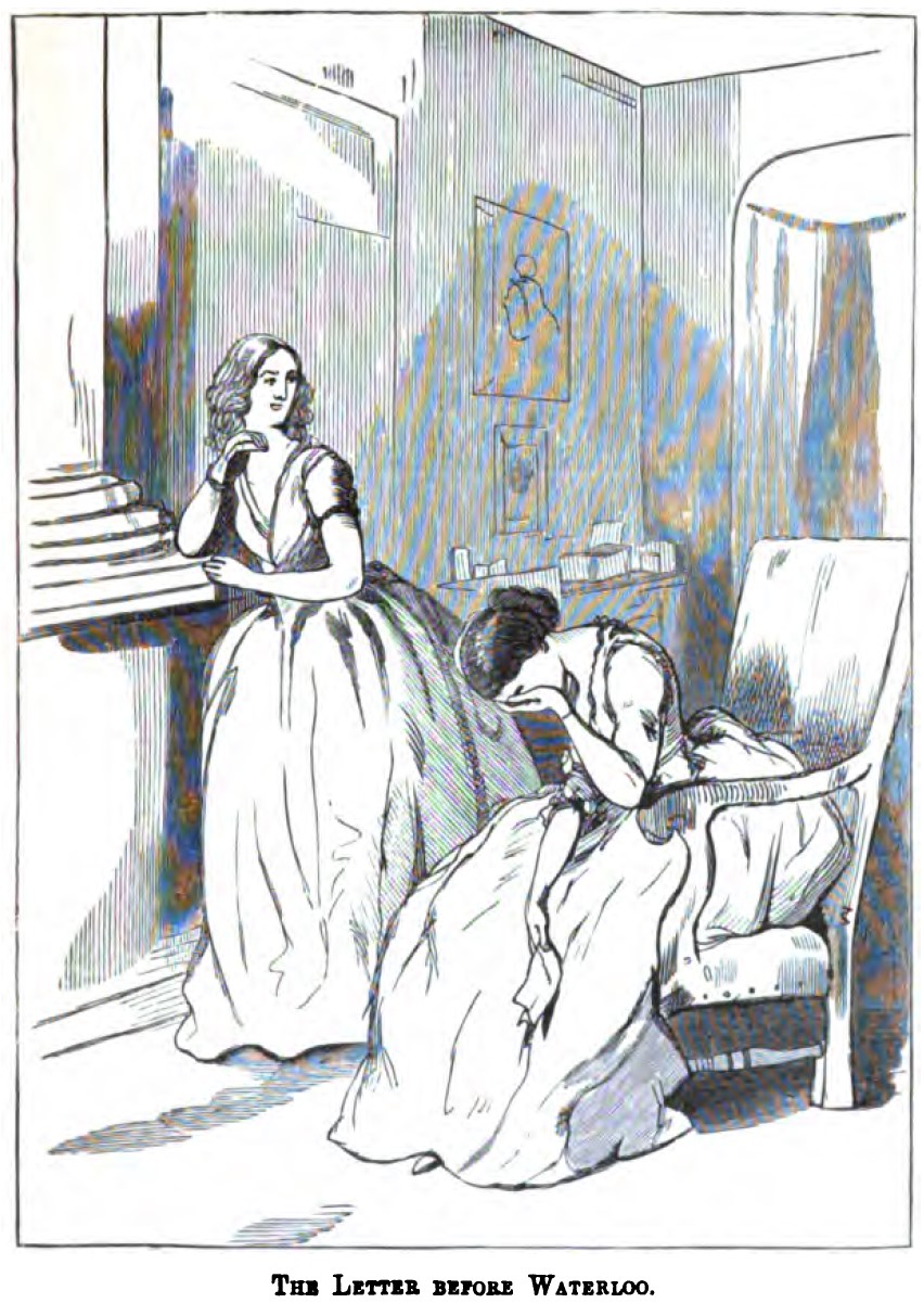 On the left, Rebecca Sharp is standing against a column and looking to the right towards Amelia Sedley, who sits crying in a chair with one hand over her face. In her other hand she holds the letter which her husband gave to Becky in an earlier chapter, asking her to run away with him. In the background can be seen two pictures on the wall, a dresser with various objects placed upon it, and part of the canopy of a bed. Below the illustration is printed its title, The Letter before Waterloo..