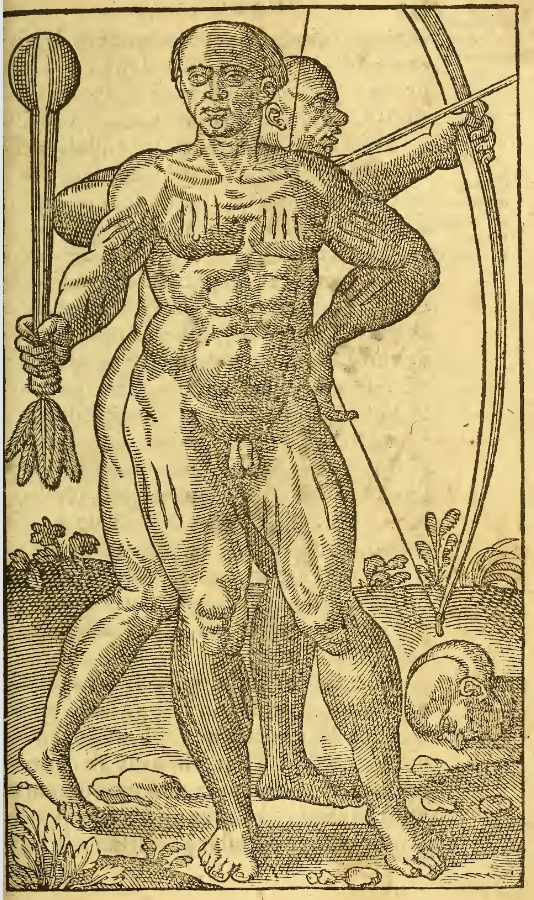 Two Tupinambá men are shown, each holding a different weapon. One man stands in front of the other, holding a club with feathers on the end in one hand. The man standing behind him points a bow and arrow at something beyond the right edge of the image. Both men are nude and have an adornment on their chin. The man in front has marks (tattoos or paint) on his chest, biceps and thighs. The head of another man from an enemy group lays on the ground behind the men.