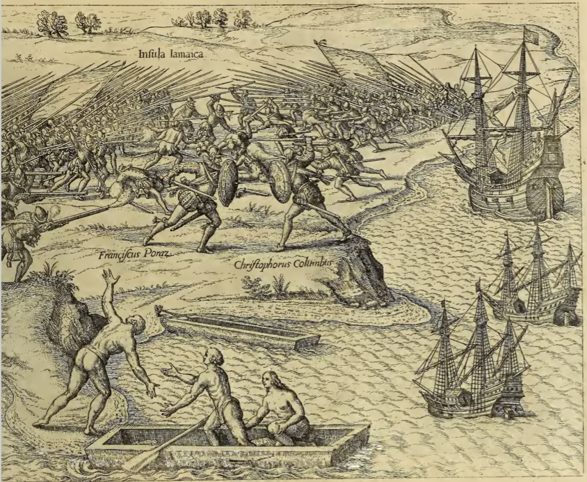On the island of Jamaica, Christopher Columbus and Francisco de Porras (both labelled in the image) engage in battle. The two men face off against each other, each armed with a sword and shield. To one side of the two men and stretching along the shore, their two armies engage in combat with muskets, swords, and spears. Three European ships are anchored along the shore. In the foreground, three Indigenous people either arrive or depart the area by canoe. One of the men, standing on the shore, gestures widely in the direction of the battle.