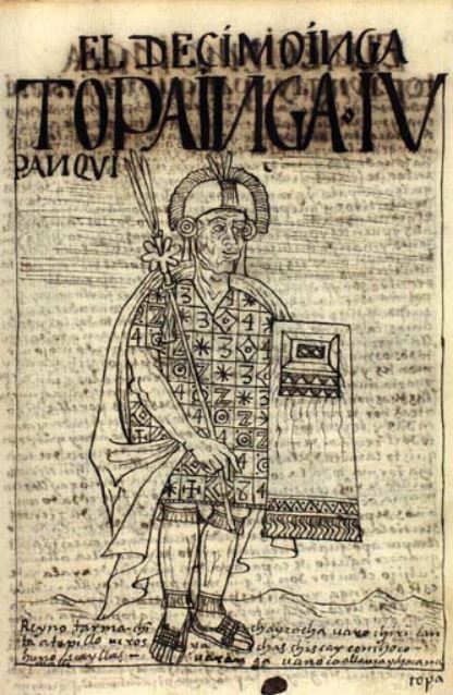 This illustration depicts the tenth king of the Inca Empire, Topa Inca Yupanqui. He is the successor of his father Pachacuti. He is depicted wearing an embroidered shirt while holding a shield in his left hand and an ax in his right. There are words written at the bottom of the image which reads, Reynó Tarma, Chinchay Cocha, Uarochiri, Canta, Atapillo, Ucros, Yachas, Chiscay, Conchoco, Huno Uayllas, Uaranga Uanoco Allauca e Ychoca, Uamalli. These are all the regions that this king had conquered during his reign. The author explains that this king named all the monuments and landmarks in his kingdom.