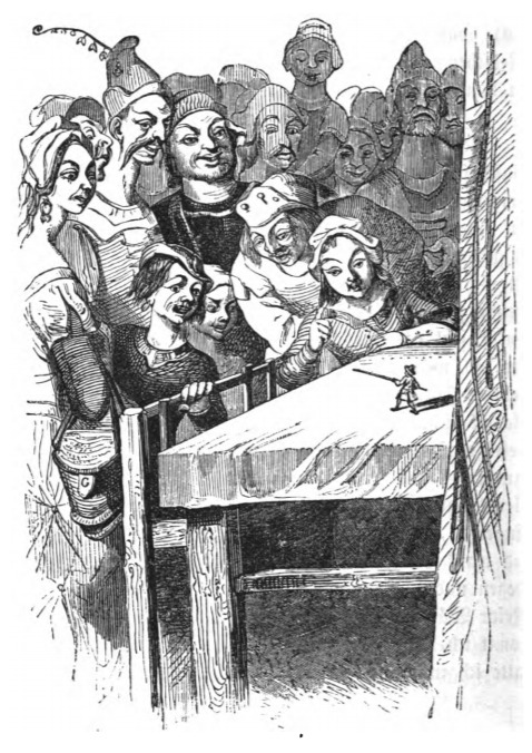 Here we see Gulliver performing for a crowd of giants. The farmer sold tickets to other giants to see Gulliver. On the front right, we see Glumdalclitch speaking to Gulliver and giving him instructions, while an older woman leans over her shoulder. Two other children stand in front of the table watching Gulliver. Behind the children are their parents. There are two more rows of giants in shadow. Gulliver stands on a table holding a piece of straw as though it was a fencing sword. The same image appears in the 1839 Krabbe edition.