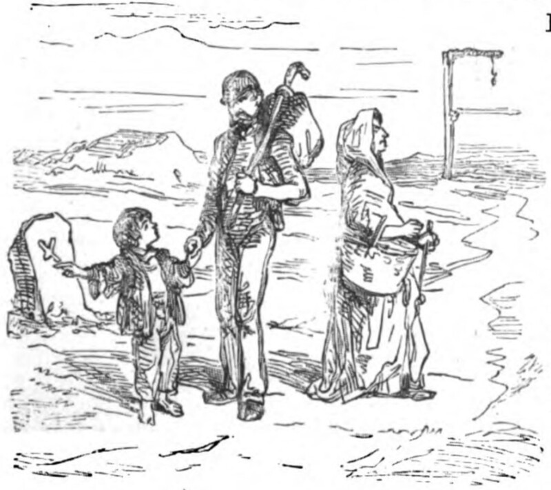 A family walks down a path next to a stone marked with an X. The man is holding the boy’s hand and carrying a basket on a stick over his shoulder. The woman is covered in a shawl, carrying a basket on one arm, and holding a walking stick in the other. She is turned to face away from the stone marker. In the background are a hill or bridge and the letter F, from Friend.