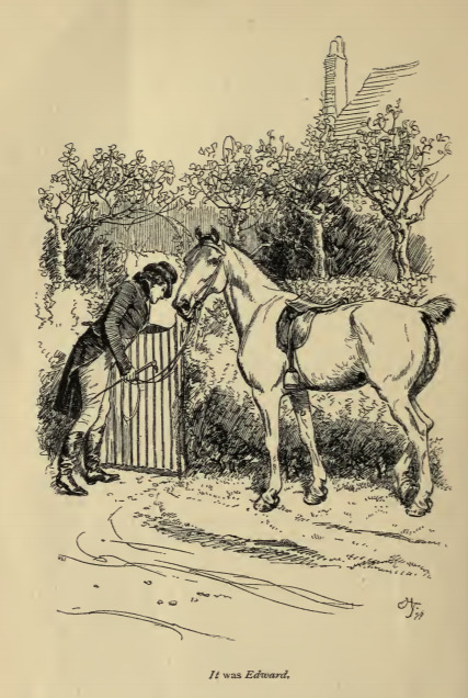 In this image Edward Ferrars arrives outside of Barton Cottage. He told Elinor that he had not married Lucy Steele and she had run away with his brother Robert. Edward came on this trip to propose to Elinor and she happily accepted. This scene occurs in chapter 48. The characters are shown in the traditional regency style. Edward Ferrars wears a waistcoat and tailcoat, with a top hat. The regency period dated to the early nineteenth century (1811-1820) when George, Prince of Wales, later George IV (r. 1820-1830), reigned as regent for his mentally ill father, King George III (r. 1760-1820). The regency period is associated with the rise of neoclassicism in art and fashion.