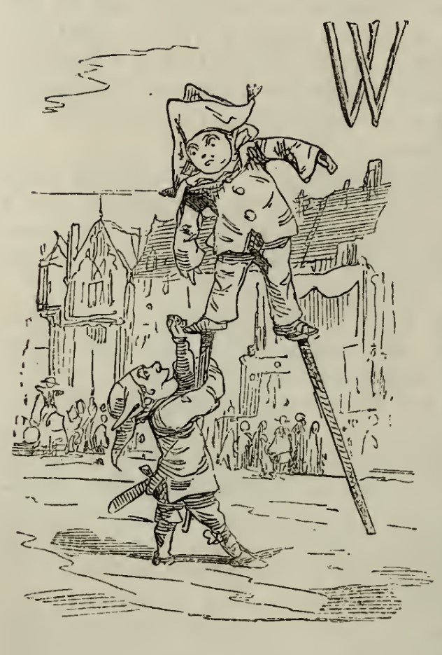 Two small figures appear to be performing in the middle of a street. One, in a triangular hat, is standing on stilts, to which the other, in a hat with two tails and a sword at his hip, clings. In the background are the shapes of buildings and people in the crowd. The top right of the image contains the letter W from When.