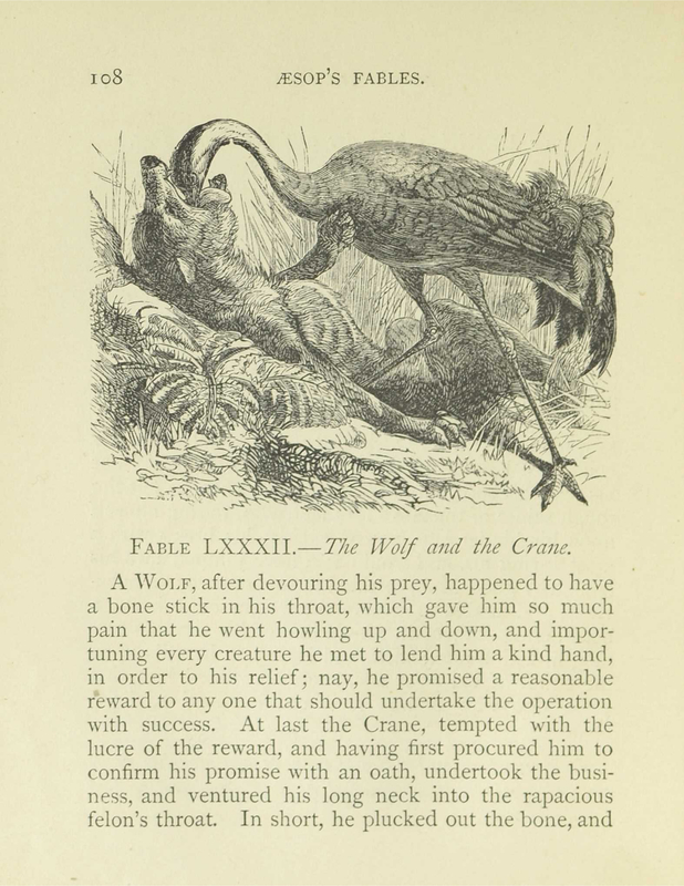 - A wolf leans back against the trunk of a tree, his mouth open and tongue falling out to the side. A crane with ornate feathers sticks its head into the wolf’s mouth to retrieve a foreign object.