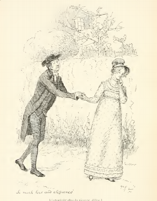 In this image Mr. Collins proposes to Charlotte Lucas. After Lizzy rejected his proposal, her close friend, Charlotte, became very attentive to him. The two grew closer and Mr. Collins proposed to her, and she happily accepted. This scene occurs in chapter 22. The characters are shown in the traditional regency style. Charlotte Lucas wears a regency style dress with an empire waistline and a bonnet to protect her face from the sun. Mr. Collins wears a waistcoat and tailcoat. The regency period dated to the early nineteenth century (1811-1820) when George, Prince of Wales, later George IV (r. 1820-1830), reigned as regent for his mentally ill father, King George III (r. 1760-1820). The regency period is associated with the rise of neoclassicism in art and fashion.