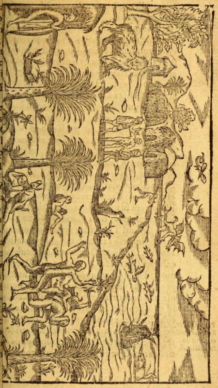 An Indigenous village is shown, full of fantastical creatures. In the center of the scene an Indigenous person speaks with two European men. A large hairy creature stands to the left of the three. In the foreground on the left an individual holding a bow emerges from a building. In the center another person lays on the ground with a horned, humanoid creature leaning over them. To the right two more individuals run from another of the horned creatures. There is a ship and a large creature in the water near the coast on the right, and further up the coast a person chases after a large winged creature. There are several structures in the background.