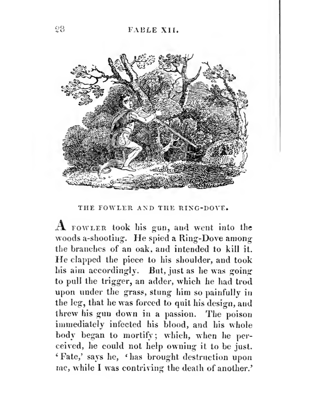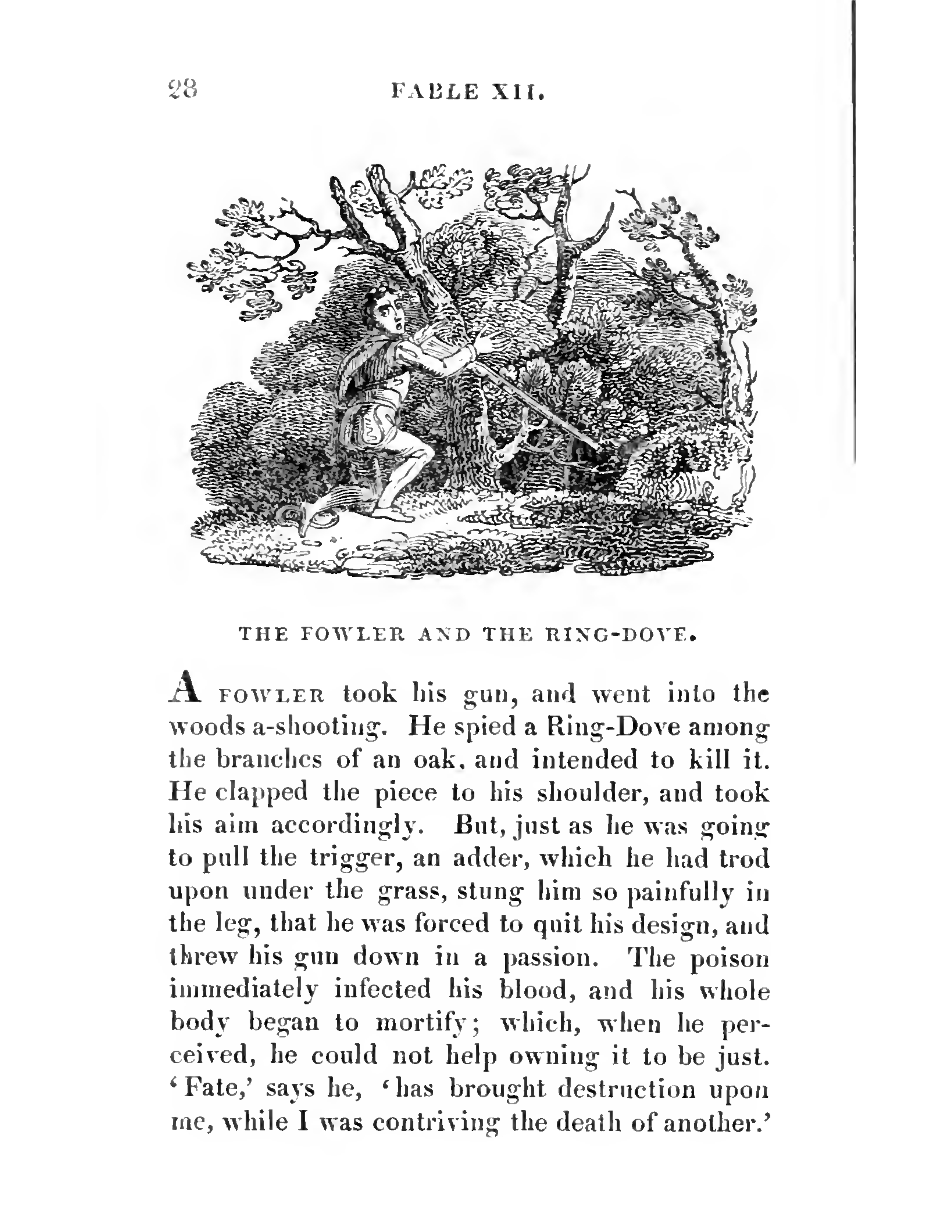 - On the middle of the illustration, a fowler lunged down amongst the woods. He dropped his gun which was aimmed towards the Ring-Dove among the branches of an oak. His face was in shock by the painfully sensation on his leg which was strung by a adder.