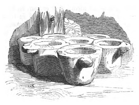 Here we see a set of cups used by the Houyhnhnms. This image appears when Gulliver explains how the Houyhnhnms use the hollow part of their pastern and hoof on their forefeet similarly to hands. Gulliver says they use this part of their bodies to do things like thread needles, milk cows, reap oats, and operate tools, including cups. These cups are made of wood and clay and are baked in the sun. The same image appears in the 1839 Krabbe edition.