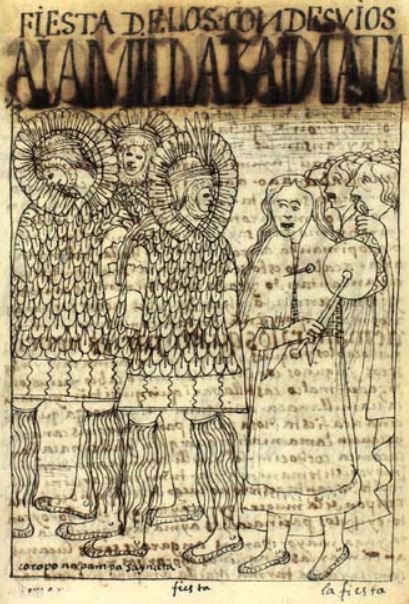 This chapter is dedicated to discussing the various celebrations and festivals that would be held in the Inca Empire. This image depicts the celebrations held in the Condesuyo region in the Inca Empire. There is a crowd of people on the right side of the image singing a song with the woman at the forefront holding and playing a drum. The three figures on the left side of the image are depicted wearing feathered clothing and a feathered head piece for the celebrations. They are also depicted wearing aya milla saynata [masks that resemble the dead]. There is a caption at the bottom of the image which identifies the location. Coropona was a peak between Arequipa and Ayacucho, which are both now modern cities in Peru.