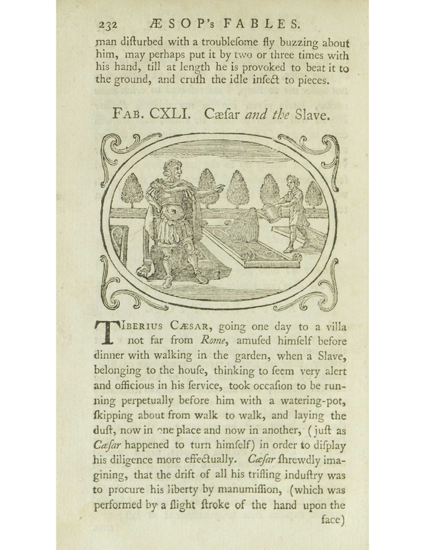 The scene is taken place outside in garden, there are five tall trees behind a fence. There are four different squares of the garden with resources in them seen in the engraving. Tribius Caesar is seen amusing him by taking a walk through the the garden talking to the slave pointing towards him as he pours water from his water-pot into the garden.
