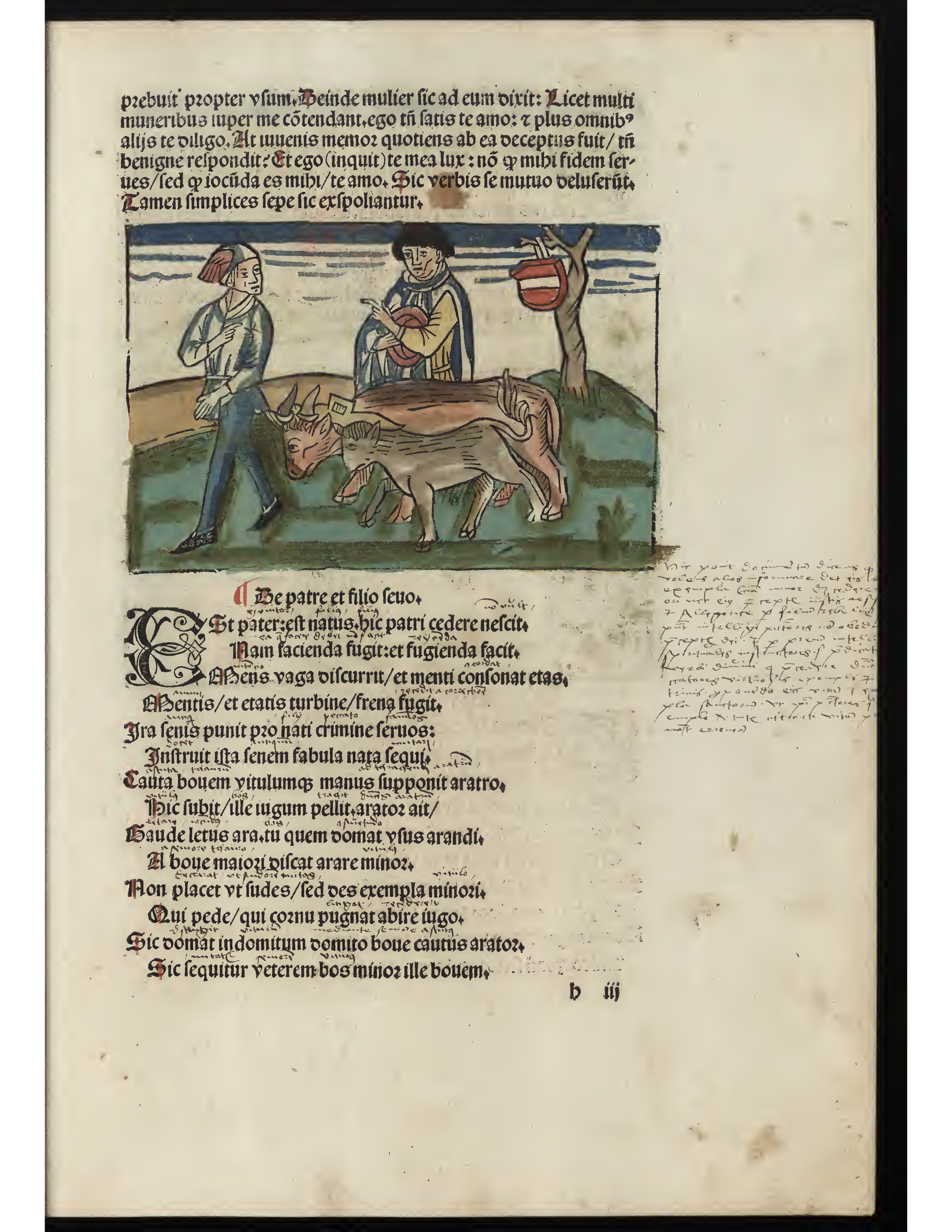 - A father walking behind his son. The son is on the left of the image, looking back at his father. The father is pointing his finger at the son. There are two animals walking beside them carting a heavy object. There is a tree in the background with a red and white bag on one of the branches.