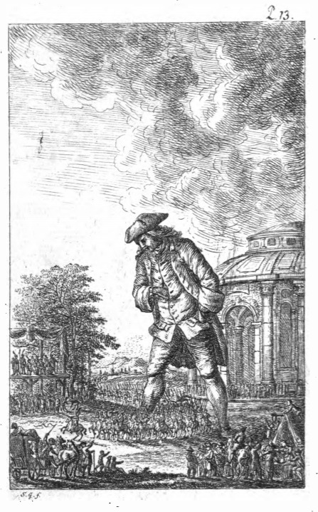 This scene shows a celebratory procession. Gulliver stands in the centre surrounded by several of the Lilliputians, who are one-twelfth of his size. In the bottom left corner there is a carriage, presumably that of the Lilliputian king, surrounded by several others. In the bottom right corner is a tent, again with Lilliputians surrounding it. On the left side in the middle is a raised, covered stage, with Lilliputians both on the stage and underneath it. Behind Gulliver is a royal building. A cavalier army rides on horseback under Gulliver’s legs, as a military procession. The same image appears in the 1761 German edition, however the 1761 German edition is coloured.