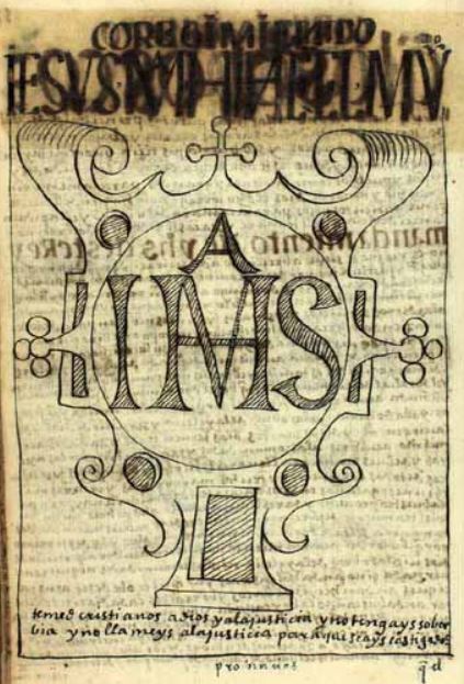 This image is illustrated in a chapter that discusses and criticizes the government and society in Spanish conquered Peru. This image depicts a crest that has the initials of Jesus and Mary which would have been on the doors of inns in Colonial Peru. The author explains that he suggested a motto should be written underneath these initials which would read, temed, cristianos, a dios y a la justicia y no tengays soberbia y no llameys a la justicia para que seays castigados [Christians, fear God and Justice, do not be proud, and do not call the justices, so that you will not be punished].