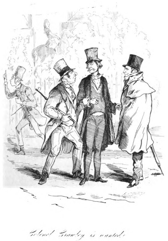Rawdon Crawley stands with Mr. Moss and his assistant each holding one of his arms. They have come to collect his debt to Mr. Nathan. Behind them, Mr. Wenham, who has no money to lend him, is leaving with his hand raised and his cane tucked under his arm. In the background, amongst the trees is a statue of a horse and rider. Below the illustration is printed in cursive its title, Colonel Crawley is wanted.