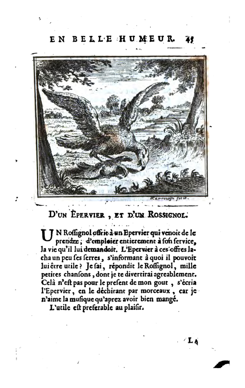 A Nightingale offered to a Sparrow hawk, who had just taken him, to employ him entirely at his service, the life which he asked of him. The Sparrow hawk at these offers let go a little of his talons, inquiring how he could be useful to him? I am making, replied the Nightingale, a thousand little songs, which I will entertain you with. This is not for the present to my taste, cried the Sparrow hawk, tearing him to pieces, for I love music only after I have eaten well.