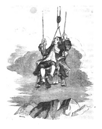 Gulliver waved his arms at the floating island of Laputa and got the attention of a few Laputans and soon a crowd assembled to see Gulliver. They lowered a chair down then raised Gulliver up to the island on the chair using a pulley system, as is seen here. Gulliver is raised up over the rocks and arrives on Laputa. The same image appears in the 1843 Krabbe edition.