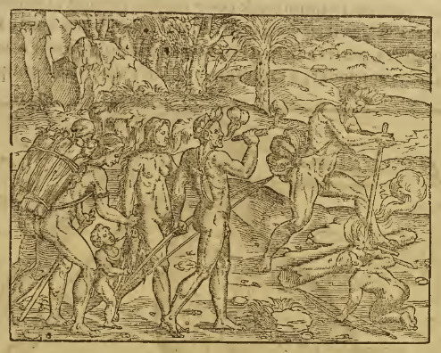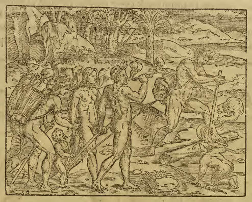 An Indigenous man wearing a feathered headdress and ornament at his back starts a fire by twirling a long stick against a log on the ground. Another man, also wearing a feathered headdress and carrying a bow, watches and smokes a cigar (or similar item). Several women and children are also amongst the group, including a small child carried in a basket on a woman’s back and another child who carries a miniature bow and kneels on the ground to watch the fire starting. This image is identical to one found on page 938 of Paris, 1575 (Chaudière), and in Thevet’s Les Singularitez de la France Antarctique (Paris 1557, Paris 1558).