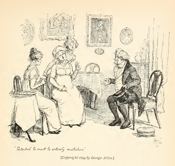 In this image Sir William Lucas sits at Longbourn, announcing the engagement between his daughter, Charlotte, and Mr. Collins. Mrs. Bennet and Lydia both rudely exclaim that they cannot believe it and that he must be mistaken. By Charlotte’s marrying Mr. Collins it meant that she would become the mistress of Longbourn after Mr. Bennet’s death, because at this time inheritance passed from one man to his closest male relative, who was Mr. Collins. This scene occurs in chapter 23. The characters are shown in the traditional regency style. Mrs. Bennet and her daughters wear regency style dresses with empire waistlines. Sir William Lucas wears a waistcoat and tailcoat. The regency period dated to the early nineteenth century (1811-1820) when George, Prince of Wales, later George IV (r. 1820-1830), reigned as regent for his mentally ill father, King George III (r. 1760-1820). The regency period is associated with the rise of neoclassicism in art and fashion.