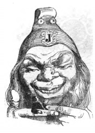 Here we see the Queen of Brobdingnag’s dwarf tormenting Gulliver. The dwarf holds Gulliver between his fingers as Gulliver leans away from him. The dwarf wears a pointed cap with bells. The letter J is on his cap, as it is the first letter of the chapter. The same image appears in the 1843 Krabbe edition.