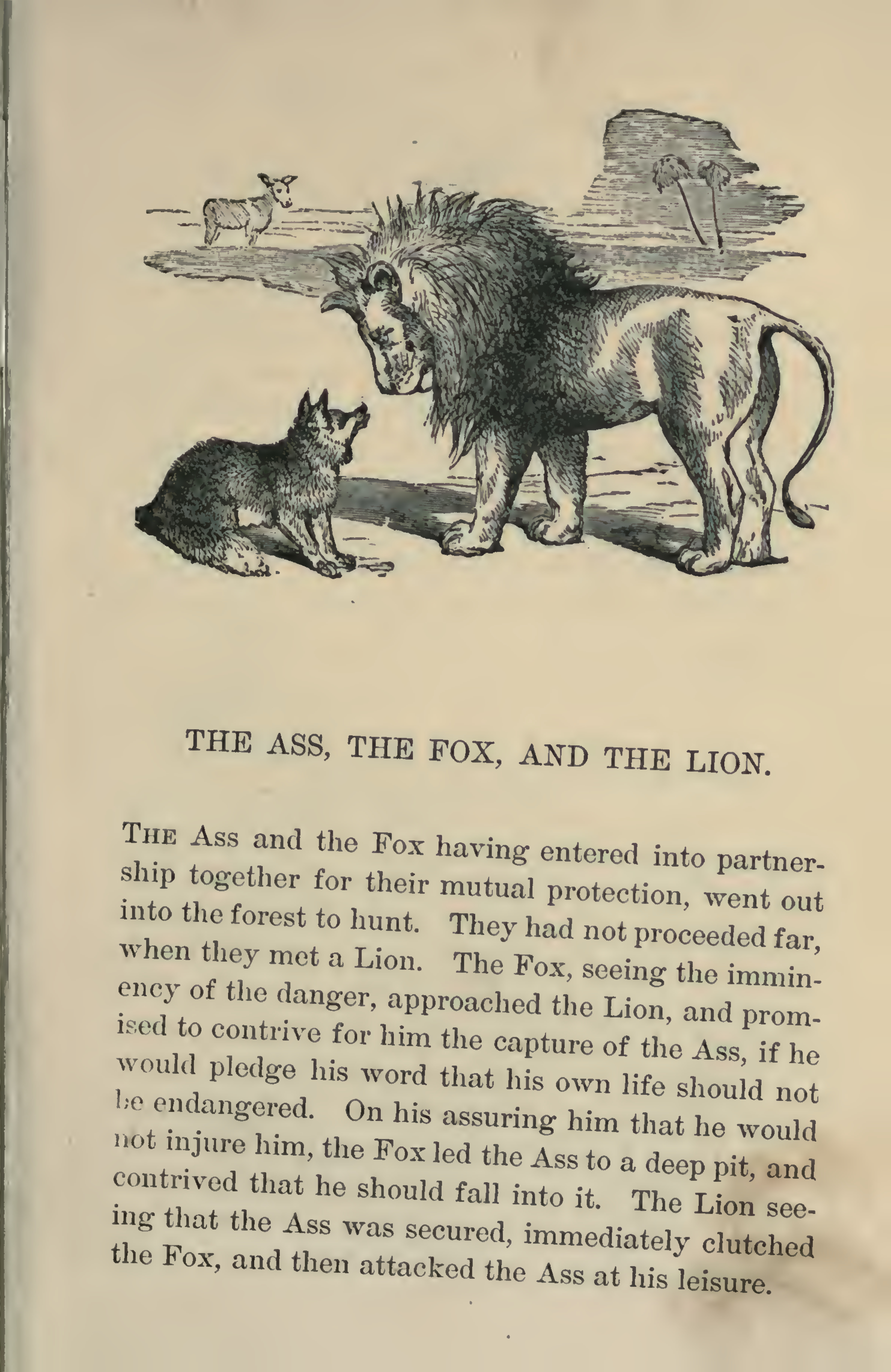 To the right, there is a lion looking to the left on the ground. Where a small fox is looking back at it. The fox is slightly bending away from the lion, as though intimidated by him. In the distance, near tall palm trees and possibly a shore, an ass stands on the far-left side of the image, looking at the fox and lion exchanging words.