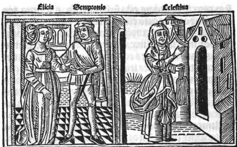Sempronio goes to Celestina’s house to negotiate Calisto’s wishes. She tells him that Calisto only paid her a small sum, and that she is trying to scam him out of more money. Sempronio reminds her that Calisto is willing to increase payment if he gets what he wants. The mutual interest of scamming Calisto unites them, and Celestina awards Sempronio one of her prostitutes, Elicia, in exchange for his loyalty (he is seen standing with her to the left). However, they doubt that Pármeno will join them in their cause, seeing as he was an assistant to Celestina when he was young and thus knows her treacherous ways. Sempronio and Elicia leave Celestina alone, and she casts a love spell (or curse) on Melibea. Now certain that she will succeed, she leaves her house to visit Melibea.