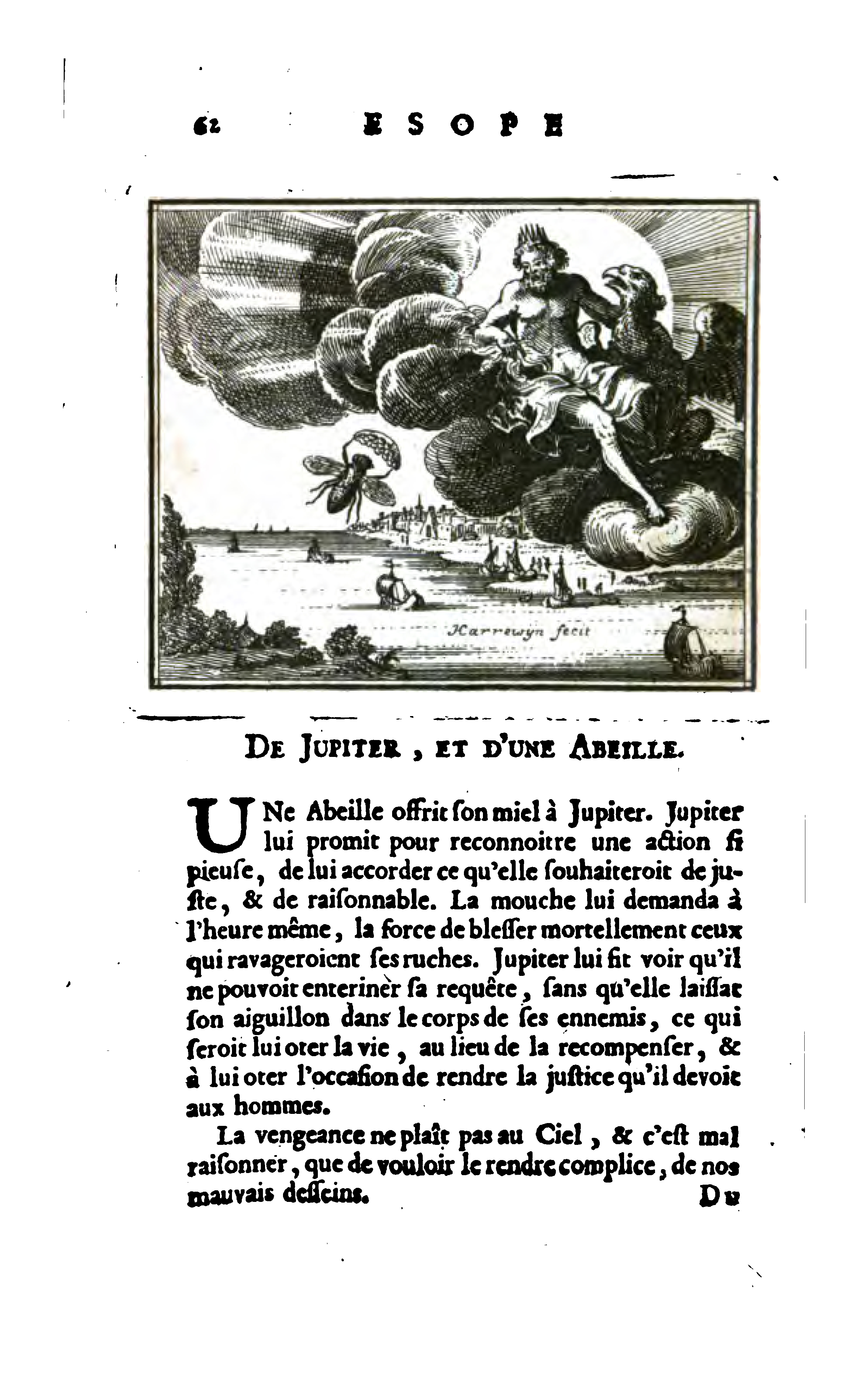 A Bee offered its honey to Jupiter. Jupiter promised her to acknowledge such a pious action, to grant her what she wished to be just and reasonable. The Bee asked him at that very moment, for the strength to mortally wound those who would ravage her hives. Jupiter saw that he could not bury her request without her leaving her sting within the body of her enemies, which would deprive her of her life, instead of rewarding her, and to deprive her of the opportunity to render the justice which he owes to men.
